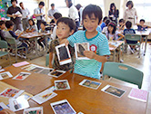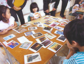 次に、「アートカード」を使ったゲーム「仲間みつけをしよう」をした。グループごとにカードを1セット(40枚)ずつ配布し、共通点を見つけて順番に発表させた。ここでは、一人ひとり見方や感じ方がちがっても良いことや、違ったとらえ方や感じ方も大切なことに気付かせ、見ることの楽しさを味わえるようにした(授業風景2)。