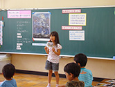 次の「お気に入りをみつけよう」では、全部のカードの中から、自分の好きな作品を選ばせ、グループの友達にその理由も具体的に話させた。その際、国語で学習した文章を思い起こさせ、簡単な文章「この作品がすきです。どうしてかというと、○○だからです。」の見本を示して練習させた(授業風景3)。さらに、全員の前で発表させたところ、多くの児童が、自分の言葉で積極的に発表することができた(授業風景4)。