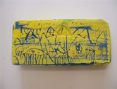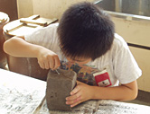 2.ほったりけずったりして絵をかこう 乾燥したリサイクル粘土に自分の好きな色を塗り、 粘土をひっかいてイメージした世界をかく。その後、下地と違った色を塗る
