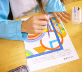 定規とコンパスを使って形を描き、色鉛筆で自由に彩色する。