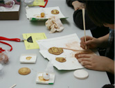 1時間程で作品鑑賞を終えた後、作業机で金貨の制作に取り組んだ。まず、丸めた茶色い紙粘土を用意し、牛乳パックを利用した粘土板の上で、ペットボトルの底の部分を使って上から押し当てた。山の形に変形した粘土に自分の横顔を描き、顔のまわりをヘラで平らにすることで、浮き彫り風の金貨を作ることができた。横顔を作るのは難しいようであったが、子どもたちは熱心に制作に取り組んだ。つま楊枝や割り箸を使って顔の周りに模様を作ったり、裏に日付を彫り込んだりといった工夫もみられた。横顔を金色の絵の具をタンポを使って塗り、金貨は完成した。最後に、出来上がった金貨を手にグループのみんなで写真を撮り終了した。