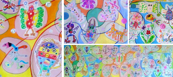- 水玉を使った作品を描き(個人)、水玉を生かした台紙に貼り、(共同・コラージュ)"水玉"の世界を楽しむ。