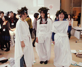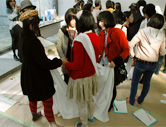 全体を通しての流れを当日変更した。着方の見本を示した後もう一度参加者に見本どおりに着てもらい写真撮影の予定だったが、自分たちで考えながら試着している段階を写真に撮った。参加者は、どのように着ているか熱心に話し合い、また他のグループの様子を参考にしたり、また展示室へ行ったりと集中していた。展示室に作品スケッチをしに行く場面では、衣服へ注目してスケッチをするという意図が充分に伝わらず、他の作品をスケッチしたりする場面もあった。着方を参考にするにあたっては、スケッチの程度により、着方の出来具合に差がでたようである。学芸員の質問の時間では、質問者の声が小さく全体に伝わらなかった。